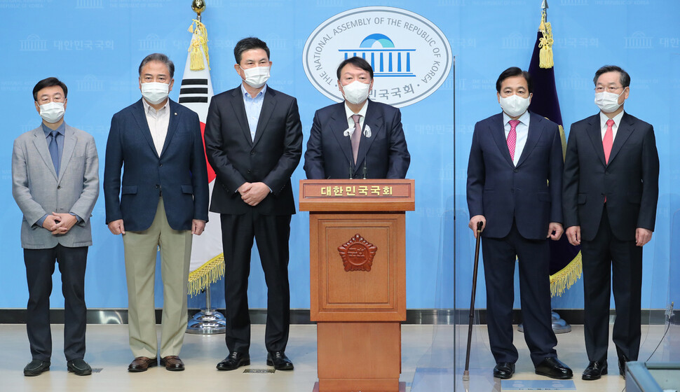 국민의힘 윤석열 대선 경선 후보가 24일 국회 소통관에서 공동선대위원장 및 공정과혁신위원회 위원장 영입 발표를 하고 있다. 왼쪽부터 신상진 공존과혁신위원회 위원장, 박진ㆍ김태호 공동선대위원장, 윤 후보, 심재철ㆍ유정복 공동선대위원장.