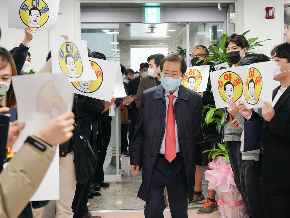 국민의힘 홍준표 대선 경선 후보가 지난 23일 서울 여의도 캠프 사무실에서 열린 2030 자원봉사단 ‘홍카단’ 임명장 수여식이 끝난 뒤 자원봉사단의 환영을 받으며 사무실로 들어서고 있다. 홍준표 캠프 제공