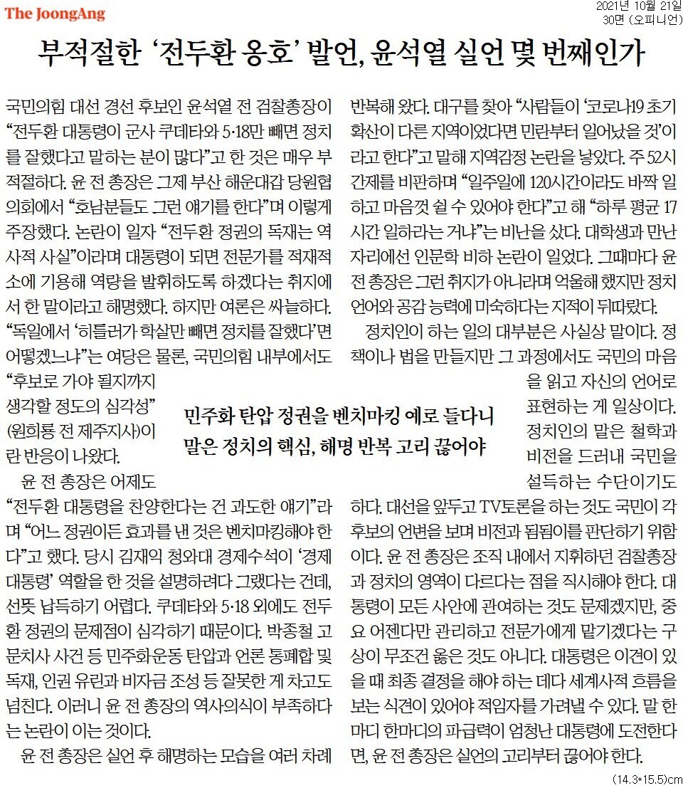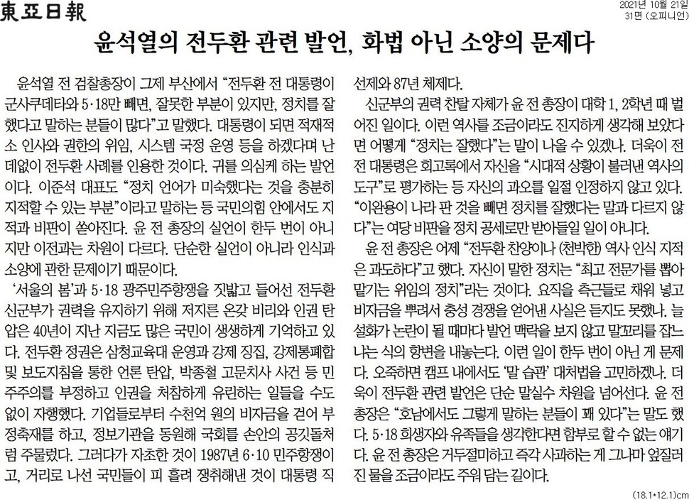 ☞ 윤석열의 전두환 관련 발언, 화법 아닌 소양의 문제다(10월 21일, 동아일보)