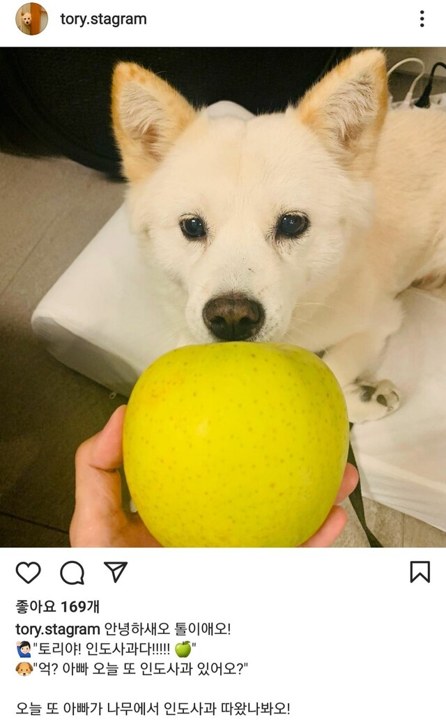 윤석열 전 검찰총장이 SNS에 올려 논란이 된 '개 사과' 사진 [윤 전 총장 반려견 SNS '토리스타그램' 캡처]