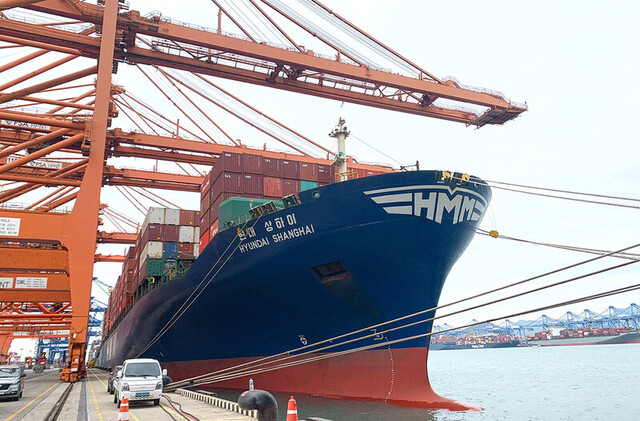 수출 화물을 싣고 부산항을 출발하고 있는 선박. HMM 제공