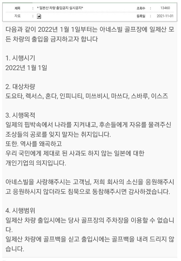 아네스빌골프장은 고객들에게 “저희 회사의 소신을 응원해주고 응원하지 않더라도 침묵으로 동참해주시면 감사하겠다”고 당부했다. 일제산 차량으로 출입하면 골프장 주차장을 이용할 수 없고, 골프백을 내려주지도 않는다고 공지했다.