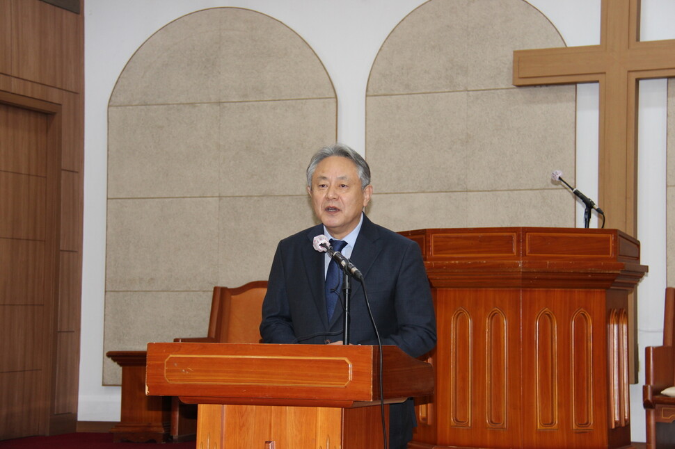 한국기독교교회협의회 총무 이홍정 목사가 4일 서울 종로구 한국기독교회관에서 노태우 전 대통령 영결식 참석 기도와 관련해 사과를 하고 있다.
