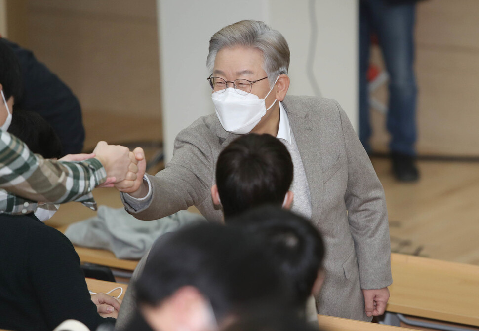야당 대선 후보 선출일에 맞춰 ‘보수의 본진’인 대구를 찾은 이재명 민주당 대선 후보는 윤 후보에게 덕담을 건넸다. 그는 경북대학교에서 대학생들과 간담회 뒤 기자들과 만나 “축하드린다. 정쟁이 아니라 어떻게 하면 우리 국민의 삶을 더 낫게 만들고 국가를 희망적으로 만들지 선의의 경쟁, 잘하기 경쟁을 했으면 좋겠다”고 말했다.
