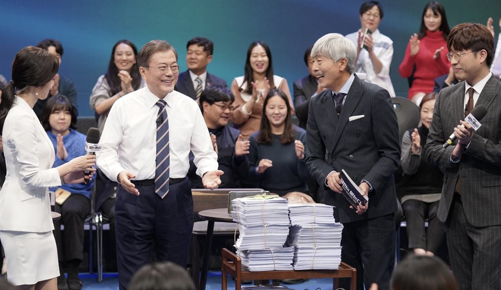 문재인 대통령이 2019년 11월 19일 오후 서울 상암동 MBC에서 '국민이 묻는다, 2019 국민과의 대화' 종료 후 시간 관계상 받지 못한 질문지를 전달받고 있다. [연합뉴스]
