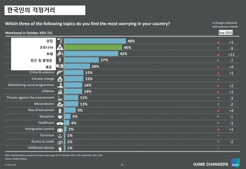 한국인들은 실업(일자리)을 가장 큰 걱정거리로 꼽았다(48%). 이어 코로나19(45%), 금융·정치 부패(42%), 빈곤·불평등(27%), 세금(20%)이 5대 걱정거리를 차지했다. 일본인의 걱정거리는 코로나(50%), 불평등(37%), 실업(29%) 차례였다.