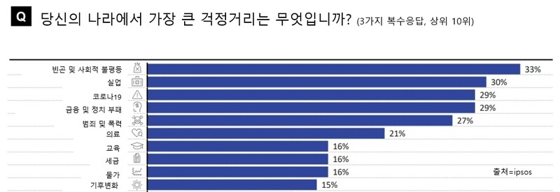 국제 여론조사업체 입소스가 28개국을 대상으로 매달 실시하는 ‘세계의 걱정거리’(What Worries World) 10월 조사 결과에 따르면, 응답자의 33%가 ‘빈곤과 사회적 불평등’을 자기 나라의 가장 큰 걱정거리로 꼽았다. 이는 9월보다 2%포인트 증가한 수치다.