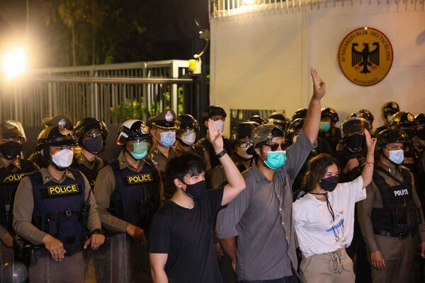 타이 민주화 요구 시위대가 왕실 개혁 요구가 위헌이라는 헌법재판소 판결에 항의해 수도 방콕에서 시위를 벌였다. 시위대는 독일로 다시 출국한 와치랄롱꼰 국왕을 겨냥해 방콕에 있는 독일대사관 앞까지 행진했다.