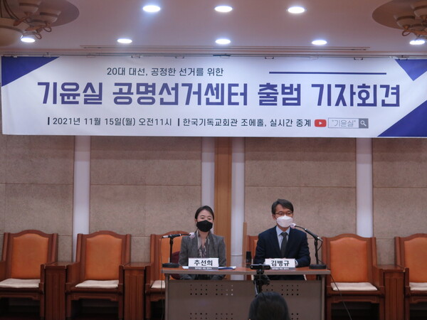 15일 서울 종로5가 기독교회관에서 기독교윤리실천 관계자들이 공명선거센터 출범 기자회견을 하고 있다. 기윤실 제공