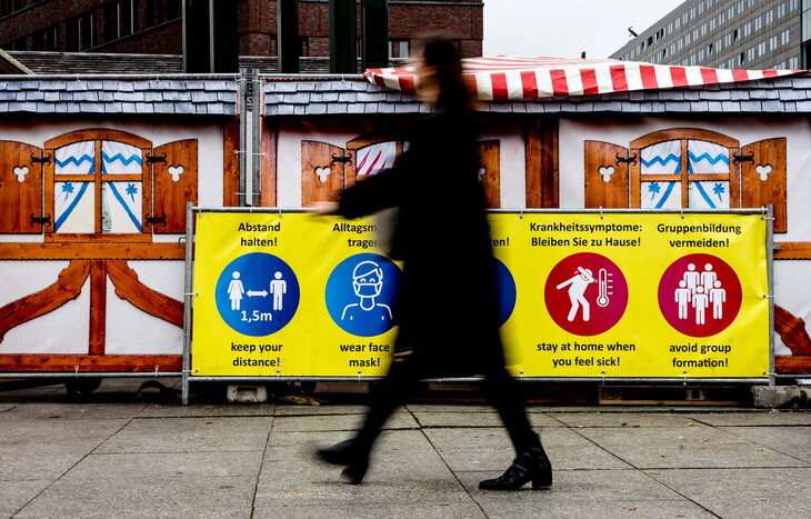 독일의 코로나19 확진자가 급증하면서 폐쇄된 수도 베를린의 크리스마스 장터 앞을 한 여성이 지나가고 있다. 베를린/EPA 연합뉴스
