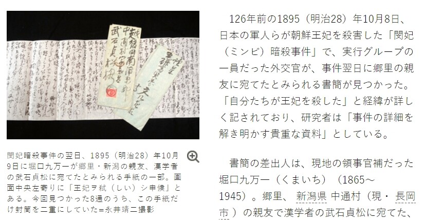 조선 공사관 영사보였던 호리구치 구마이치(1865~1945)는 명성황후 시해 다음 날인 1895년 10월9일에 니가타현의 친구에게 보낸 편지에 “우리가 왕비를 죽였다”며 명성황후 시해 사건 경위를 상세히 적었다고 일본 <아사히신문>이 16일 보도했다. 호리구치는 이 편지에서 “진입은 내가 담당하는 임무였다. 담을 넘어 (중략) 간신히 건물 안쪽에 들어가 왕비를 시해했다”고 적었다. 그는 “생각보다 간단해 오히려 매우 놀랐다”고 감상까지 적었다. 그는 일본 외교관, 경찰, 민간인 등으로 구성된 명성황후 시해 실행 그룹 중 한 명이었다.