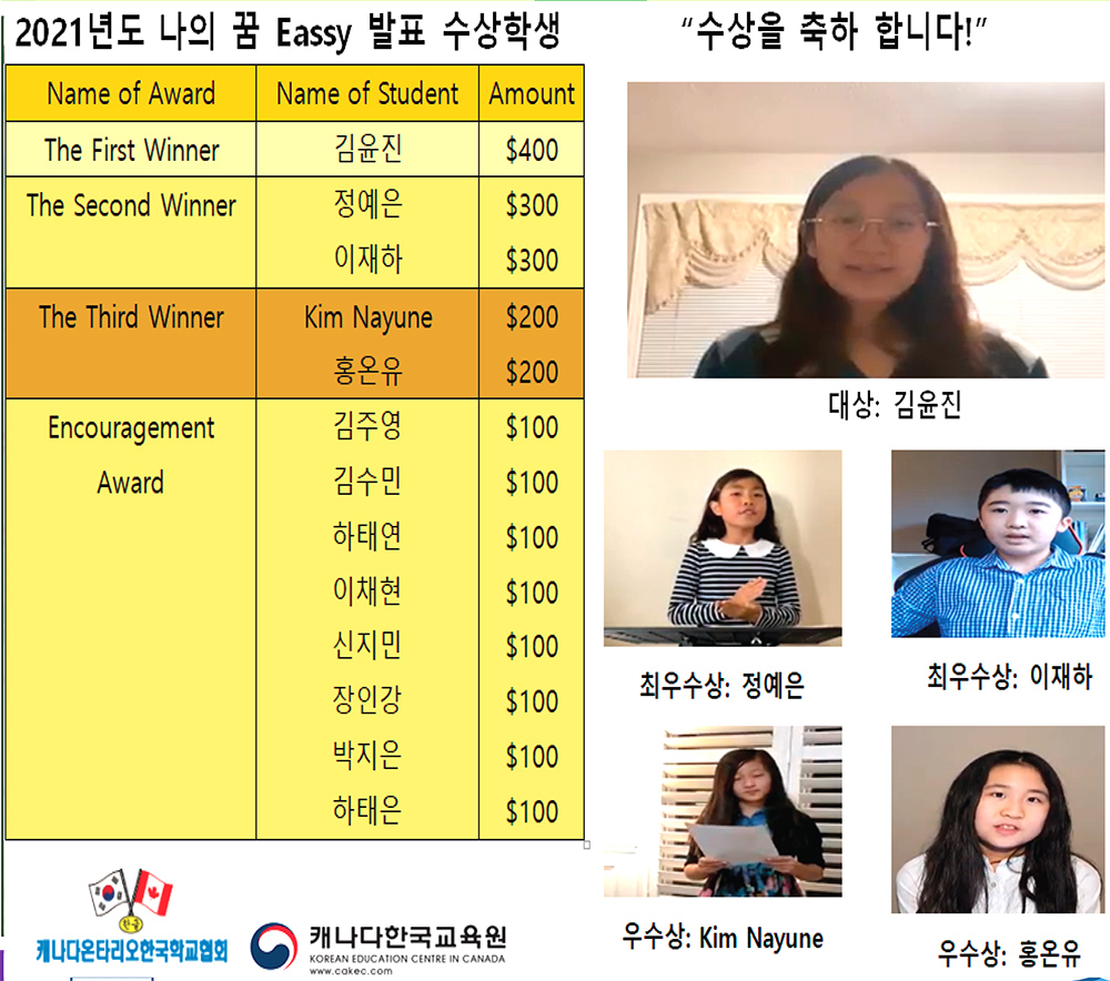 온타리오 한국학교협회(회장 신옥연)와 총영사관 한국교육원(원장 이종원)이 공동 주최한 ‘나의 꿈’에세이 발표대회에서 김윤진 양(10학년)이 영예의 대상을 차지해 장학금 400달러를 받았다.