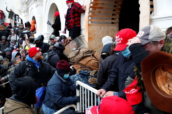 지난 1월6일 미국 워싱턴 의사당에서 도널드 트럼프 대통령 지지자들이 의사당 안으로 난입하며 의회 경찰과 충돌하고 있다. 워싱턴/로이터 연합뉴스
