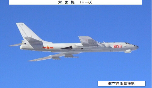 2017년 1월 중국 폭격기 등 군용기 8대가 9일 대한해협 동수도(일본명 ‘쓰시마 해협’) 상공을 통과해 동중국해와 동해 사이를 왕복 비행한 것을 긴급 발진한 일본 자위대 전투기가 확인했다고 일본 언론이 전했다. 사진은 당시 일본 방위성 통합막료감부가 누리집에 공개한 중국 H-6 폭격기 모습.