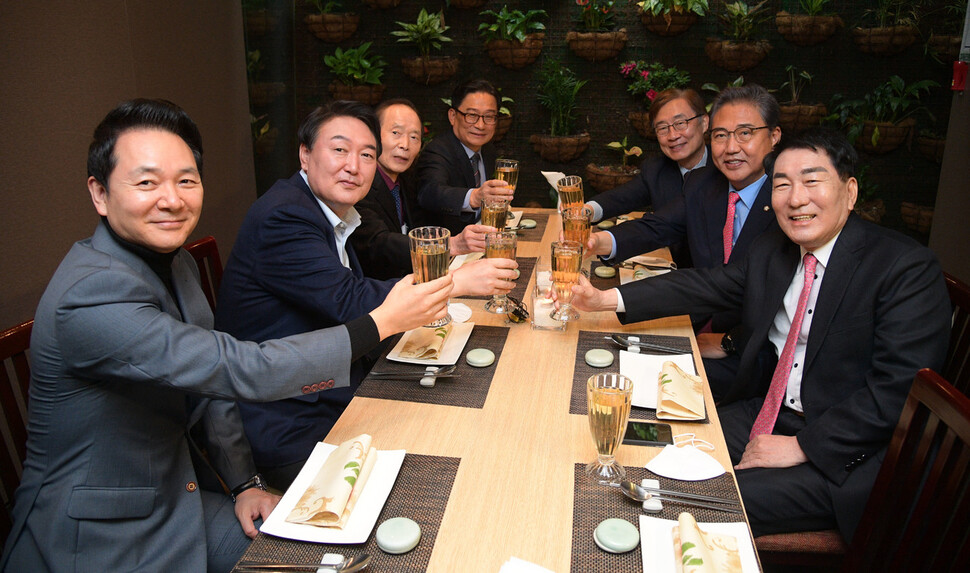 국민의힘 윤석열 대선 후보가 23일 서울 여의도의 한 음식점에서 열린 대선 경선 후보들과의 오찬에서 ‘물잔 건배’를 하고 있다. 왼쪽부터 장성민 세계와동북아평화포럼 이사장, 윤석열 후보, 장기표 신문명정책연구원장, 박찬주 전 육군대장, 최재형 전 감사원장, 박진 의원, 안상수 전 인천시장.