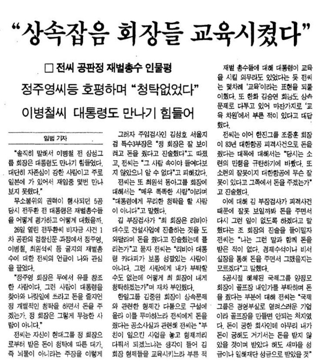 ‘12·12 및 5·18사건과 전두환·노태우 권력형 부정 축재사건에 대한 1심 판결문’을 보면, 전씨는 이병철 당시 삼성그룹 회장으로부터 1983년 12월부터 1987년 10월까지 8차례에 걸쳐 220억원의 불법 정치자금을 받았다. 금융·세제 운용 등 기업 경영과 관련한 직무를 수행하는 데 있어서 삼성그룹을 선처해달라는 취지였다. 전씨는 마찬가지로 정주영 현대그룹 회장으로부터 1982년 12월부터 1987년 12월까지 7차례에 걸쳐 220억원의 뇌물을 수수했다. 이외에도 최종현 선경 회장으로부터 150억원, 김승연 한국화약 회장으로부터 70억원을 챙겼다. 다만 기업 총수들은 5년의 공소시효가 지났다는 이유로 기소되지 않았다.