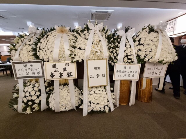 25일 서울 서대문구 신촌세브란스병원에 마련된 전두환씨 빈소 옆에 놓인 재계 인사들의 근조화환. 왼쪽부터 최태원 대한 상공회의소 회장(SK그룹 회장), 이재용 삼성전자 부회장, 김승연 한화그룹 회장, 허창수 전국경제인연합회 회장, 정의선 현대차그룹 회장.