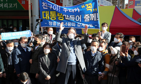 이 후보는 이어 전남 강진을 찾아 농민들과 ‘국민 반상회’를 연 뒤 오후에는 전남 여수와 순천으로 이동해 항만 육성 정책을 발표한다. 여수 관광명소인 낭만포차 거리를 걸으면 2030 세대와도 소통에 나선다. 이 후보의 부인 김혜경씨도 오후부터 일정에 합류한다. 장흥/서영지 기자
