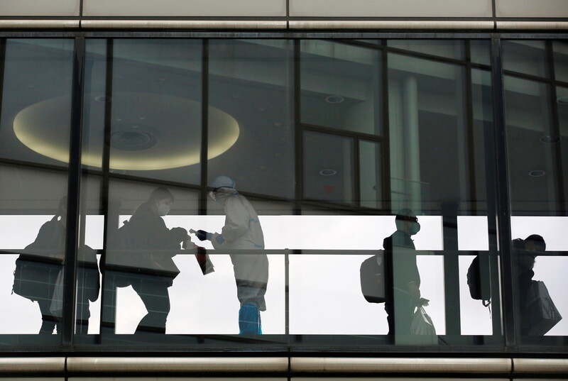30일 방호복을 입은 일본 나리타공항 관계자가 대기하고 있는 승객의 체온을 재고 있다. 도쿄/로이터 연합뉴스