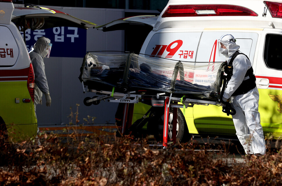 코로나19 위중증 환자가 연일 최다치를 기록하는 가운데 1일 서울 은평구 서울시립서북병원에서 119 구급대원 및 의료진이 확진 환자를 감염 방지용 카트에 실어 옮기고 있다. 연합뉴스