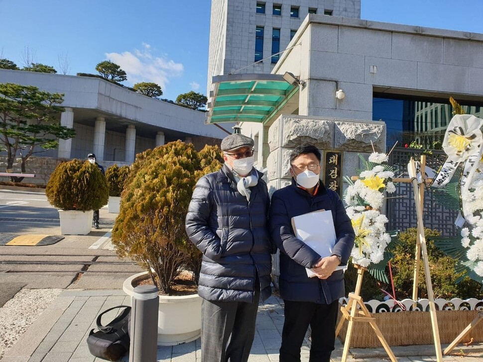 서울 서초구 대검찰청 앞에서 고 이미란씨의 형부 김영수(65·왼쪽)씨와 하승수 변호사가 ‘서울중앙지검의 조선일보 방씨일가 관련 사건 봐주기·축소 기소 및 재판부의 공소장 변경 요구 거부에 대한 감찰’ 진정서 제출 취지를 설명하고 있다. 전광준 기자
