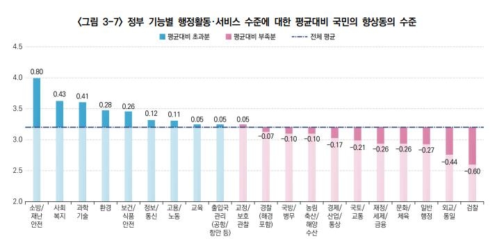 전체 기능의 평균인 2.96점보다 높은 분야는 정보/통신(3.49점), 과학기술(3.34점), 출입국관리(3.26). 보건/식품안전(3.14점) 등이었다.