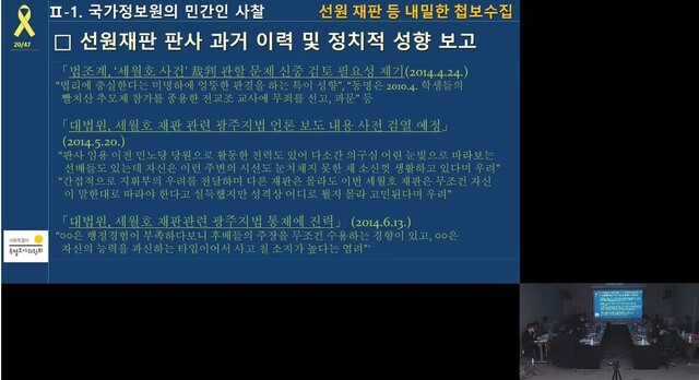 사참위가 공개한 자료를 보면, 국정원이 세월호 선원 재판 판사의 전력과 정치적 성향 등을 파악한 정황이 드러난다. 국정원은 세월호 참사가 발생한 지 9일째인 2014년 4월24일, ‘법조계, 세월호 사건 재판 관할 문제 신중 검토 필요성 제기’라는 제목의 첩보를 작성했다. 이후 세월호 선원들이 살인, 업무상 과실 등의 혐의로 기소(2014년 5월15일)된 뒤인 2014년 5월20일에는 ‘대법원, 세월호 재판 관련 광주지법 언론 보도 내용 사전 검열 예정’이라는 제목의 문건이 작성됐다. “판사 임용 이전 민노당 당원으로 활동한 전력도 있어 다소간 의구심 어린 눈빛으로 바라보는 선배들도 있는데(중략) 소신껏 생활하고 있다고 우려”, “간접적으로 지휘부의 우려를 전달하며 다른 재판은 몰라도 이번 세월호 재판은 무조건 자신이 말한대로 따라야 한다고 설득했지만 성격상 어디로 튈지 몰라 고민된다며 우려” 등의 판사 세평이 담겼다. 세월호 선원들의 첫 재판(2014년 6월10일)이 열린 뒤인 6월13일에 작성된 ‘대법원, 세월호 재판 관련 광주지법 통제에 진력’ 문건에도 “○○은 행정경험이 부족하다 보니 후배들의 주장을 무조건 수용하는 경향이 있고, ○○은 자신의 능력을 과신하는 타입이어서 사고 칠 소지가 높다는 염려” 등의 법원 내부자들이 알만한 세평이 적혀 있었다.