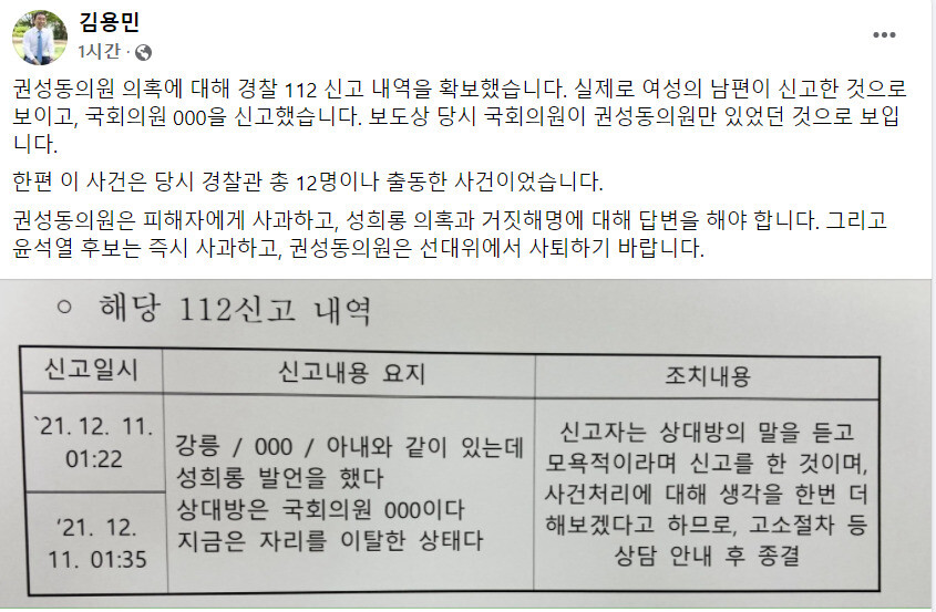 김 의원은 14일 에스엔에스에 공개한 당시 112 신고 내역을 보면, 지난 11일 새벽 1시22분과 1시35분 “아내와 같이 있는데 성희롱 발언을 했다. 상대방은 국회의원 000이다. 지금은 자리를 이탈한 상태”라는 신고가 접수됐다. 현장에 출동한 경찰은 12명이나 됐던 것으로 전해졌다. 경찰은 “신고자는 상대방의 말을 듣고 모욕적이라며 신고를 한 것이며, 사건 처리에 대해 생각을 한번 더 해보겠다고 하므로 고소 절차 등 상담 안내 뒤 종결”이라고 적었다. 김 의원은 “당시 국회의원이 권성동 의원만 있었던 것으로 보인다”며 “권성동 의원은 피해자에게 사과하고, 성희롱 의혹과 거짓 해명에 대해 답변을 해야 한다”고 적었다.
