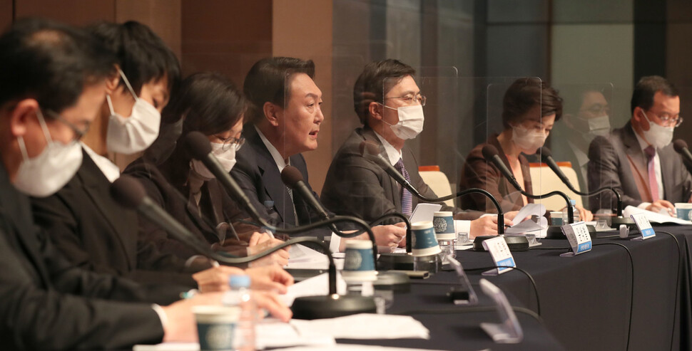 윤석열 국민의힘 대선후보가 14일 오전 서울 중구 프레스센터 국제회의장에서 열린 관훈클럽 초청 토론회에서 모두발언을 하고 있다.