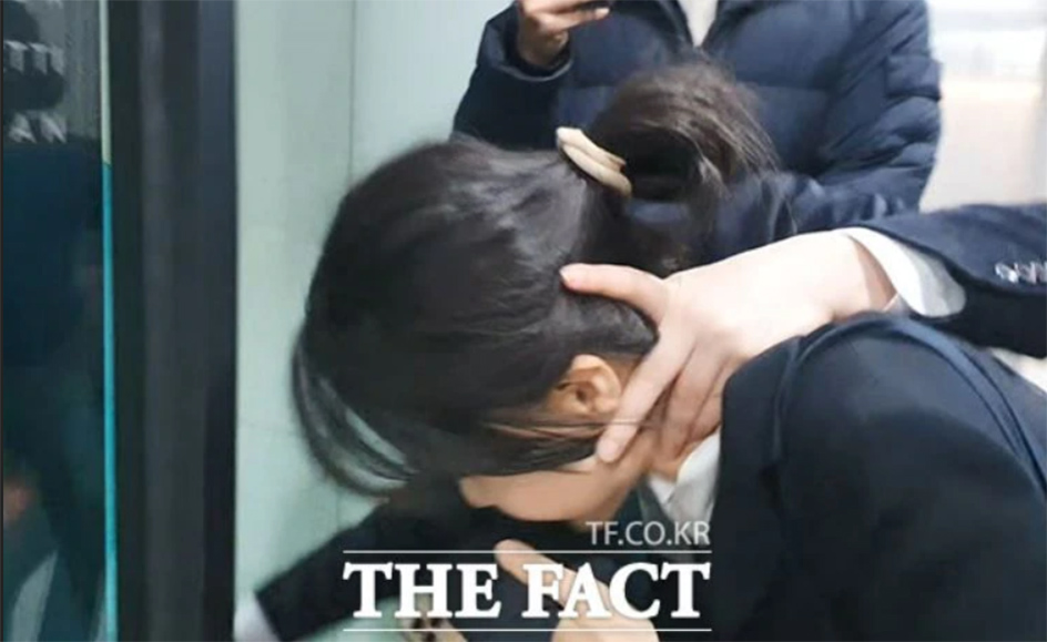 지난 14일 <더팩트> 카메라 앞에서 급히 피하는 김건희 씨 모습.