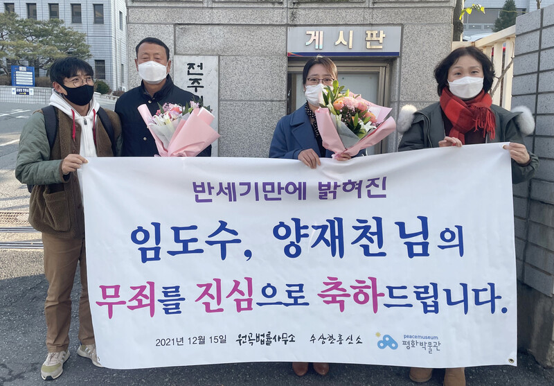 15일 오전 전주지법 군산지원 앞에서 52년 만에 반공법 무죄 판결을 받은 고 임도수, 양재천씨의 가족들이 소감을 말하고 있다. 연합뉴스