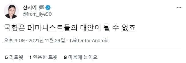 신 부위원장은 지난달 24일 당시 국민의힘 선대위 공동선대위원장직을 제안받은 상태였던 이수정 경기대 범죄심리학과 교수의 인터뷰 기사를 공유하며 “국힘은 페미니스트들의 대안이 될 수 없죠”라고 적었다.