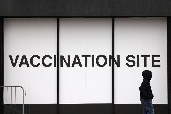18일 미국 뉴욕에서 시민 한명이 코로나19 백신 접종소 앞을 지나가고 있다. 뉴욕/로이터 연합뉴스
