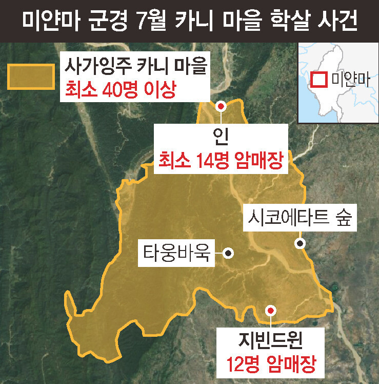 최근 수개월 동안 미얀마 전역에서 미얀마군과 시민방위군 간의 충돌이 거세지면서 비슷한 집단 학살이 자주 벌어지고 있다. 미얀마 언론은 8일 전날에도 사가잉주 한 마을에서 10대 청소년을 포함해 민간인 11명이 미얀마군에 붙잡혀 불태워진 채 발견됐다고 보도했다. 미얀마 인권단체인 정치범지원협회(AAPP) 집계를 보면 쿠데타 이후 군경의 폭력으로 숨진 이들은 20일 기준 1346명에 이른다. 최현준 기자