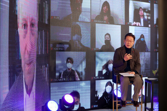 마이클 샌델 하버드대 교수와 화상 대담하는 이재명 대선 후보=더불어민주당 이재명 대선 후보가 21일 서울 중구 정동1928 아트센터 이벤트홀에서 마이클 샌델 하버드대 교수와 '대전환의 시대, 대한민국은 어떻게 공정의 날개로 비상할 것인가'의 주제로 화상 대담을 하고 있다. 이번 대담에는 온라인을 통해 공개 모집한 국민참여단 현장 패널 15명도 참석했다.