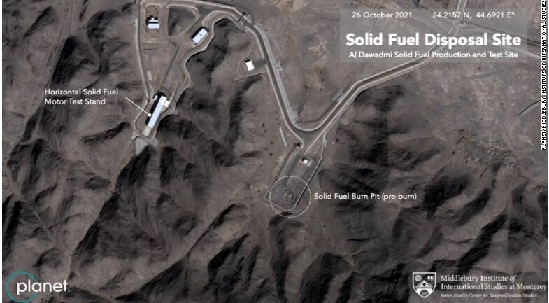 상업 위성이미지 회사인 플래닛이 지난 10월26일과 11월9일 사이에 찍은 위성사진을 보면, 사우디 중부 다와드미의 한 시설에서 탄도미사일 제작과 관련한 연소 실험이 이뤄졌음을 알 수 있다. 이 위성사진을 분석한 미들버리 국제문제연구소의 무기전문가인 루이스 교수는 “핵심적인 증거는 이 시설이 탄도미사일 생산에 필요한 고체연료의 잔여물 처리를 위한 ‘연소실험 시설’(원문에선 불구덩이·burn pit라 표현)을 작동시키고 있다는 것”이라고 지적했다.