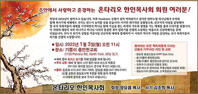 온타리오 한인목사회(회장 양요셉 기쁨이충만한교회 담임목사)가 2022년 신년예배와 하례식을 새해 1월3일(월) 오전 11시 기쁨이충만한교회(1100 Petrolia Rd. North York, M3J 3L7)에서 개최한다.