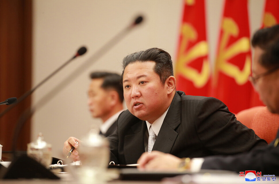 대남·대외 정책과 관련해선 김 총비서가 “다사다변한 국제정치정세와 주변환경에 대처해 북남관계와 대외사업부문에서 견지해야 할 원칙적 문제들과 일련의 전술적 방향들을 제시했다”는 한 문장이 전부다. 모두 66글자로 전원회의 결과 보도문의 0.4%다. 정책 방향을 가늠할 구체적인 내용이 전혀 없다. 지난 2년간 신년사를 대체한 2019년 12월 7기5차 전원회의와 2021년 1월 노동당 8차 대회, 이전 신년사의 대남·대남 정책 분량과 비교할 수 없을 정도로 간소하다. “대북 적대시 정책과 이중기준 철폐” 따위 기존 공식 견해의 재확인도 없다. 대남·대외 정책을 명시적으로 밝힐 “때가 아직은 아니다”라는 판단이 깔린, 정세 변화와 상황에 맞춰 대응하겠다는 ‘정책 숨기기’로 읽힌다. 통일부는 “유동적 국제 정세 하에서 상황에 따라 대처 방침을 수립·판단해 주요 계기마다 입장을 표명하리라 예상된다”고 짚었다.