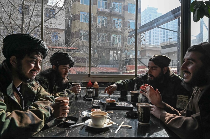 탈레반 전사들이 지난 31일 아프가니스탄 카불의 음식점에서 커피를 마시며 대화하고 있다. 카불/AFP 연합뉴스