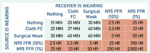 하지만 전파자와 비감염자가 모두 N95마스크를 쓴다면 이 시간을 25시간(통과율 10% 기준)으로 늘릴 수 있다. 특히, 둘 다 마스크를 꼭 맞게 착용해 통과율을 1%로 봉쇄한 조건에서는 감염에 필요한 시간이 무려 2천500시간이 된다.