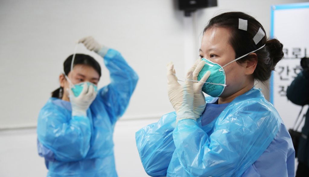 가운과 N95마스크 착의 시범 보이는 간호사 [연합뉴스]