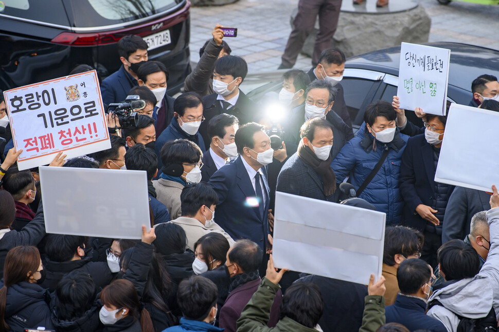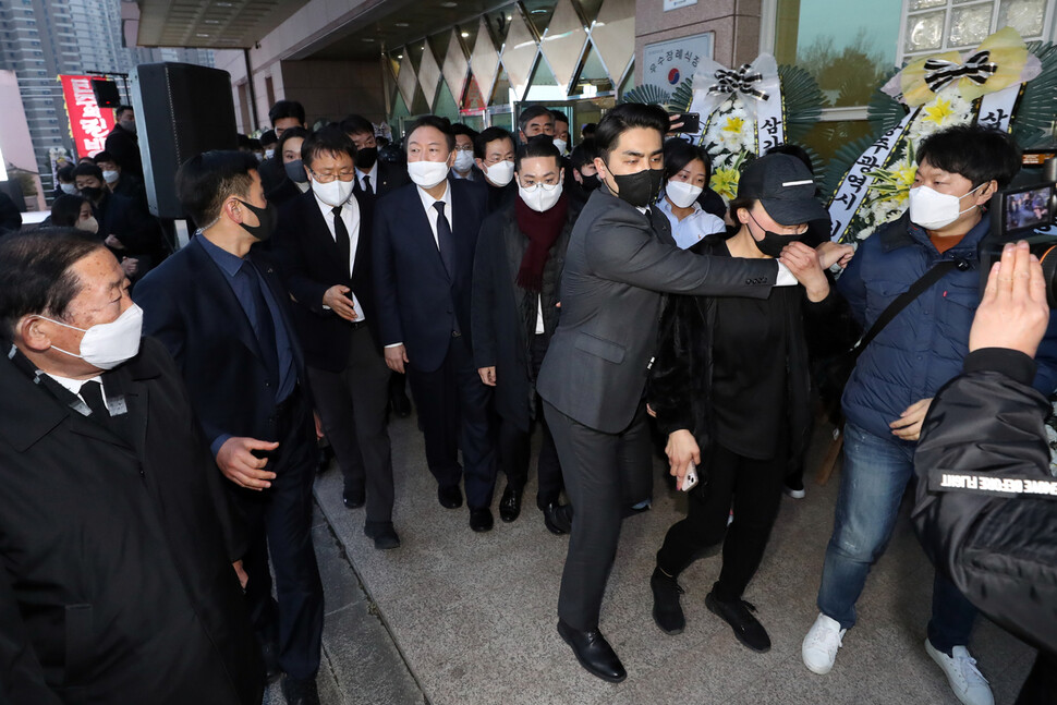 윤석열 국민의힘 대선 후보가 10일 오후 광주 동구 학동 조선대병원 장례식장에 마련된 이한열 열사의 어머니 배은심 여사의 빈소를 찾아 조문한 뒤 대학생들의 항의를 받으며 장례식장을 떠나고 있다.