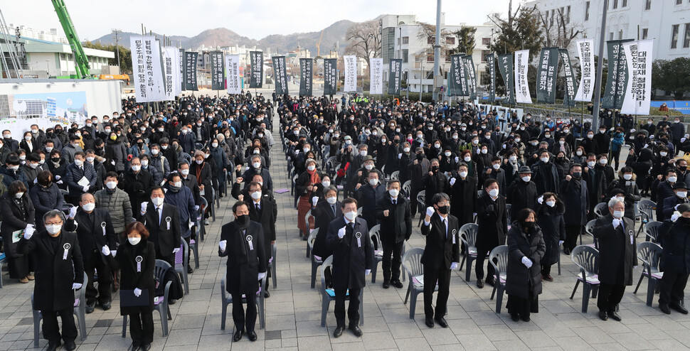 이한열 열사의 어머니 고 배은심 여사의 추도식이 시작되기 전, 배 여사의 생전 육성이 울려 퍼졌다. 2017년 5월 세월호 유가족들이 광주 5·18 국립묘지를 찾았을 때 남긴 메시지다. 10일 저녁 서울 서대문구 연세대학교에 마련된 ‘한열 동산’에서 이한열기념사업회 주최로 열린 배 여사의 추도식에는 추운 날씨에도 3백명이 넘는 시민들이 모여 촛불을 켜고 자리를 지켰다. 한 손엔 핫팩, 한 손엔 추도사가 인쇄된 종이를 들고 선 이들은 20대 청년부터 머리가 희끗한 50대, 60대 장년까지 다양했다.
