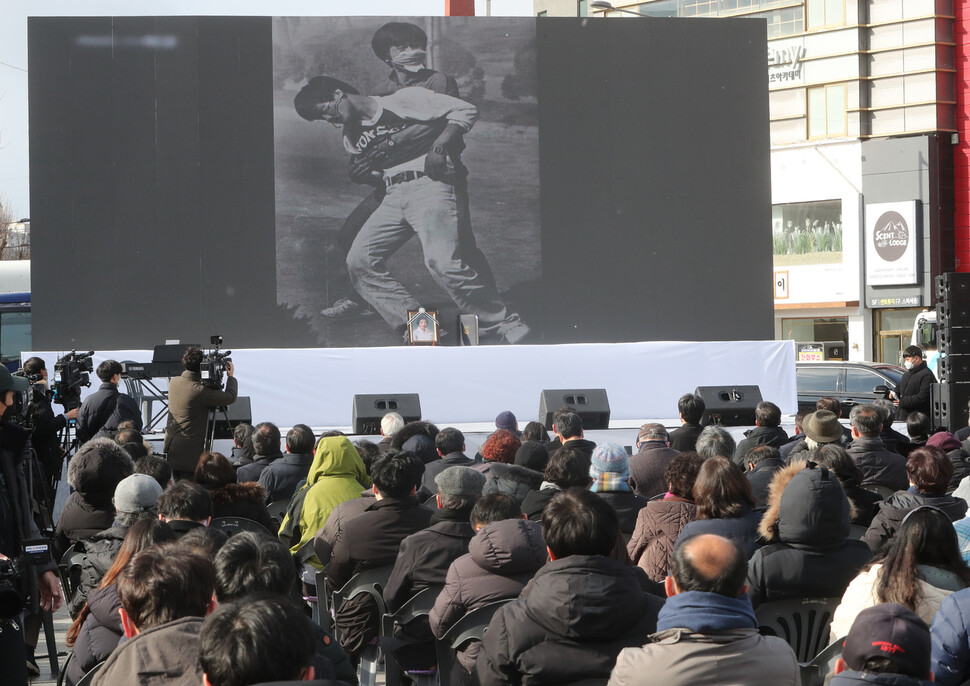 11일 오전 광주 동구 5.18민주광장에서 열린 `민주의 길, 배은심 어머니 사회장' 영결식에 앞서 상영된 추모 영상 중 고 이한열 열사의 최루탄 피격 직후 사진이 보이고 있다. 광주/김태형 기자