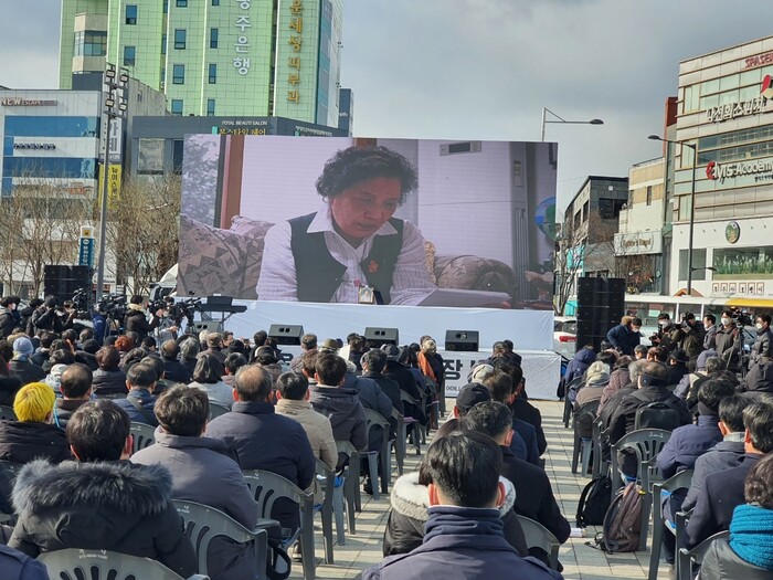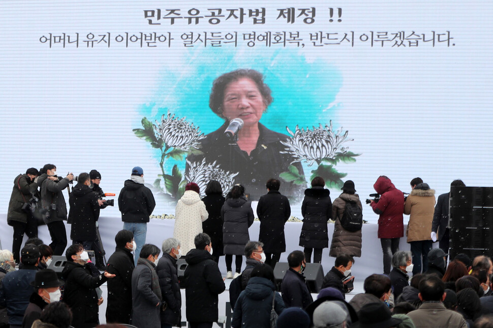 11일 오전 광주시 동구 금남로 5·18민주광장에서 노제를 겸해 열린 고 배은심 여사 영결식에서 장녀 이숙례씨가 인사말을 했다. 5남매의 장녀인 이씨는 지난 9일 황망하게 세상을 뜬 어머니를 떠올리며 눈시울을 붉혔다. 이씨는 “오늘 눈도 내리고 춥네요, 엄마. 그런데도 이렇게 많은 분이 모여 있어요. 항상 엄마 마음을 아리게 했어요. 아들 가슴에 묻고 35년을 사셨던 엄마. 아들 보고 싶어 부르던 피맺힌 절규도 이젠 들을 수 없겠네요”라며 눈물을 훔쳤다.