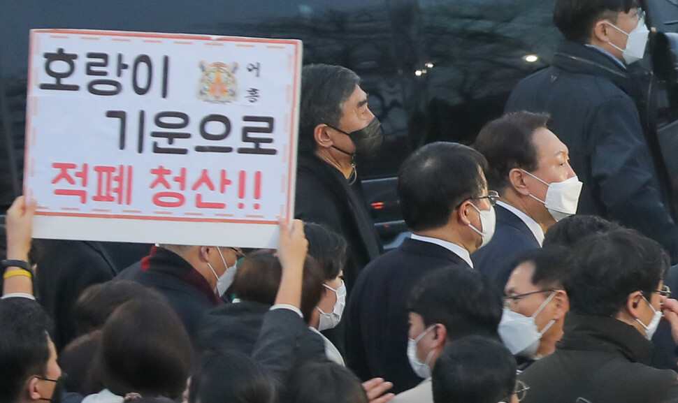 윤석열 국민의힘 대선후보가 10일 오후 이한열 열사의 어머니인 고 배은심 여사의 빈소가 마련된 광주 동구 조선대병원 장례식장을 찾아 대학생 진보 단체들의 시위인파 가운데로 장례식장을 향하고 있다.