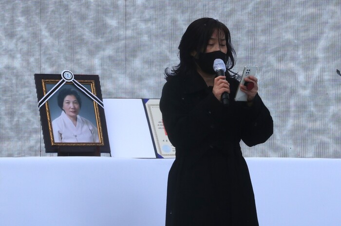 11일 오전 광주시 동구 금남로 5·18민주광장에서 노제를 겸해 열린 고 배은심 여사의 영결식에서 장녀 이숙례씨가 인사말을 하고 있다.