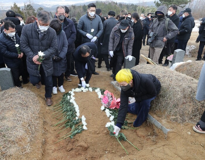 11일 오후 고 배은심 여사의 유해가 광주 망월묘지공원 8묘원에 안장돼 추모객들이 헌화하고 있다.