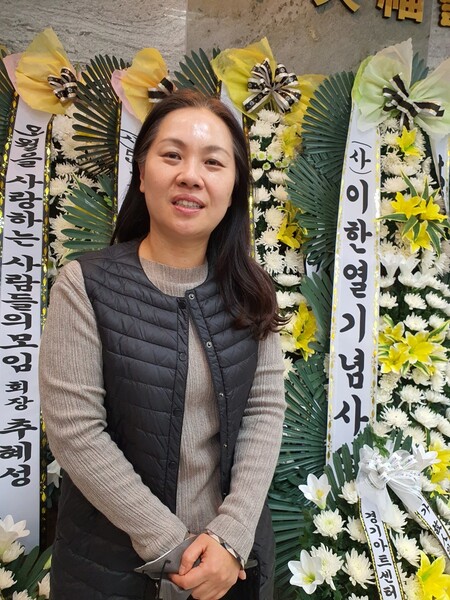 10일 서울 마포구 이한열 기념관에 차린 배은심 여사 분향소. 오른쪽으로 이한열 열사의 사진이 보인다. 연합뉴스