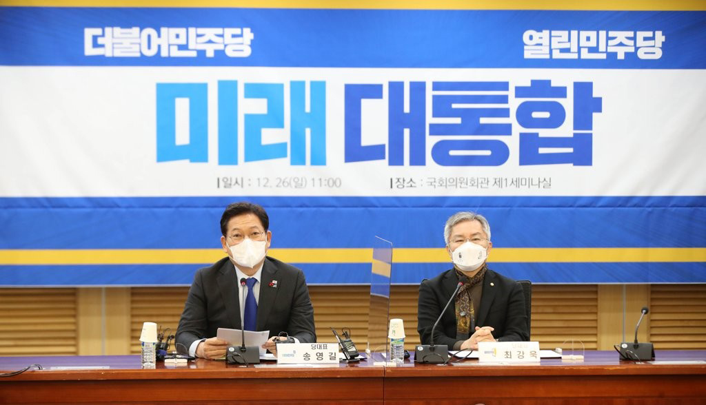 민주·열린민주, 합당 합의= 더불어민주당 송영길 대표(왼쪽)와 열린민주당 최강욱 대표가 지난달 26일 오전 국회 의원회관에서 양당 통합 관련 회동을 하고 있다.